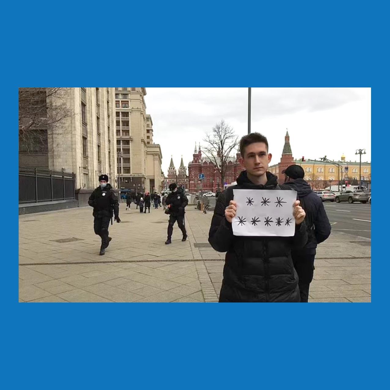 Een ander post op hun Facebook-pagina gaat over Dmitry Reznikov. Hij hield een papier vast met asteriksen en werd gearresteerd. Vermoedelijk staat er op zijn papier 'geen oorlog' in het Russisch. Dit soort protest wordt meer gedaan in Rusland. Ooit is een man gearresteerd die een wit blad omhoog hield. Hij zei dat hij niks hoeft te zeggen, dat iedereen weet wat het probleem is. Hoe krachtig kan een beeld zijn met enkele lettertekens zonder iets te zeggen.