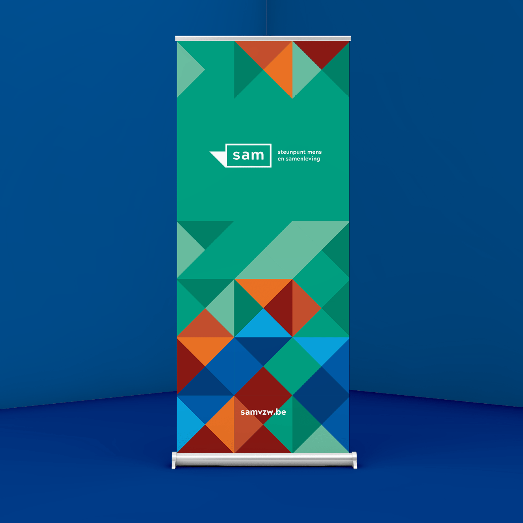 SAM staat voor steunpunt Mens en Samenleving en is een fusie van vijf steunpunten die samen alle facetten van onze samenleving ondersteunen. We ontwikkelden een huisstijl, gebaseerd op die verschillende facetten. Na enkele jaren van samenwerken evolueerde het merk verder, werd het DNA duidelijker en de missie en visie meer uitgesproken. Het werd tijd voor een diepgaand onderzoek naar alle producten, diensten en andere communicatie. Een merkstructuur bracht duidelijkheid.